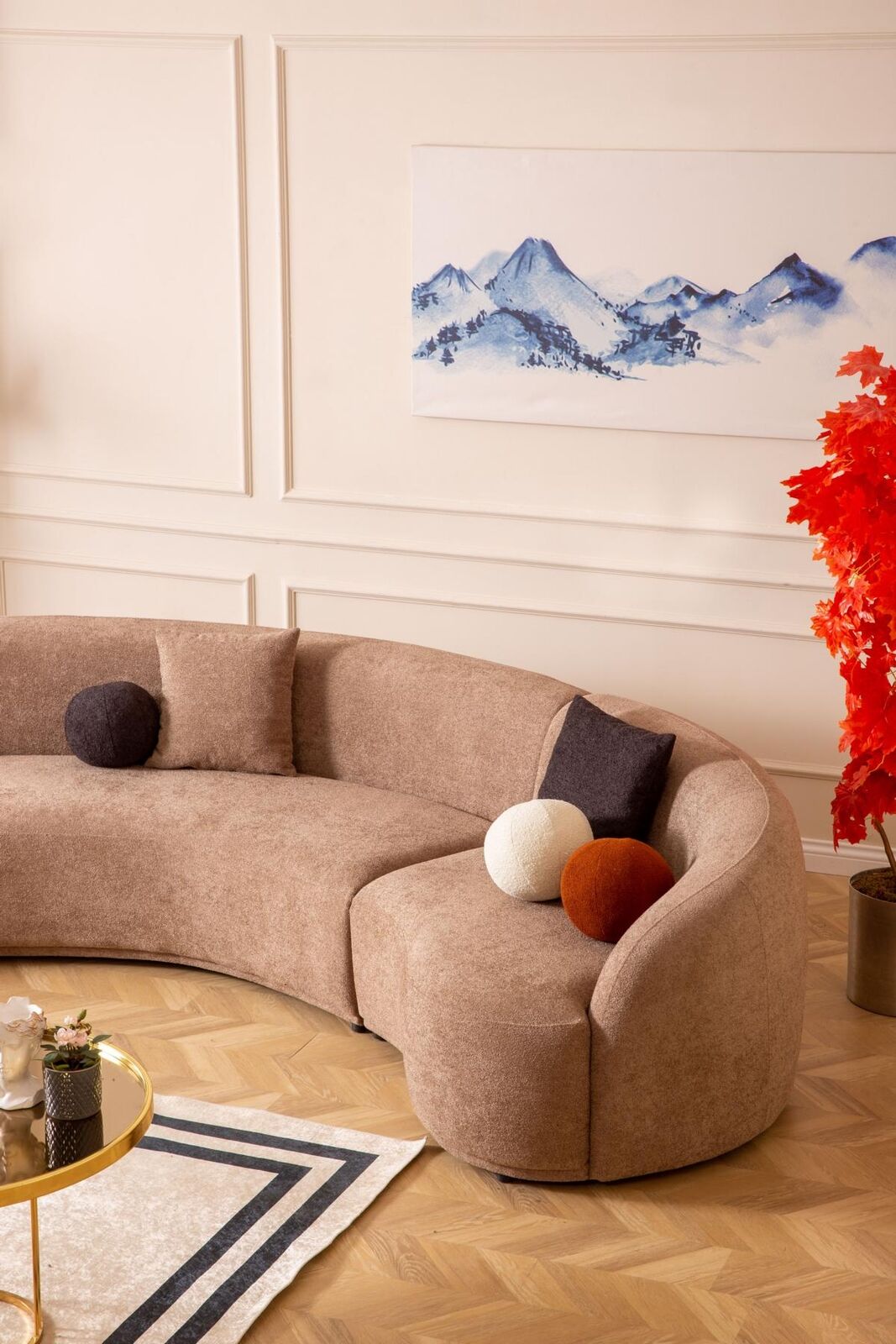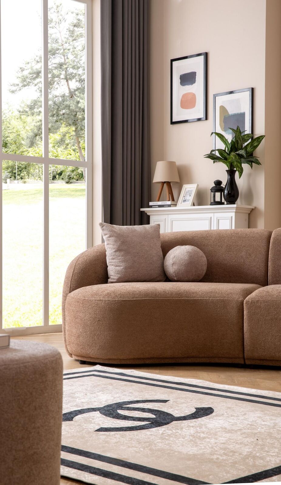 Mots-clés : Canapé design, canapé rond marron, mobilier moderne, canapé de luxe, ensemble de salon