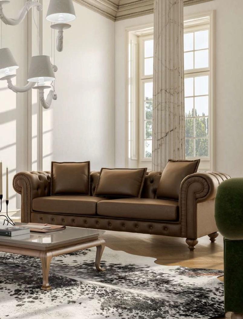 Mots-clés : Canapé Chesterfield marron, ensemble luxueux, moderne trois places, fauteuil, textile, ensemble canapé 3+3+1, design exquis, mobilier de salon