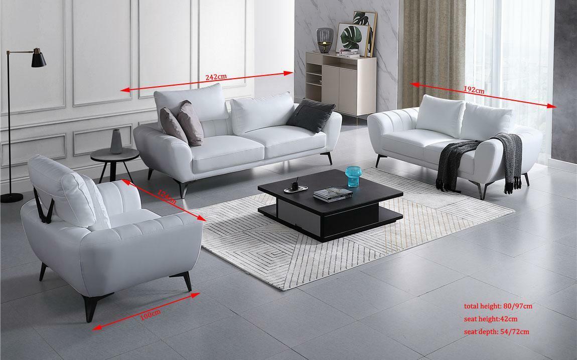 Mobilier en cuir ensemble complet - canapés élégants designer mobilier de salon assise est un ensemble de canapés luxueux conçu pour apporter une touche d'élégance et de style à votre salon. Cet ensemble comprend un canapé 3 places spacieux ainsi qu'un fauteuil confortable, tous deux fabriqués avec un matériau de haute qualité : tissu en fibre de cuir premium (70% cuir / 30% polyester). La couleur est entièrement personnalisable, offrant ainsi une liberté de choix pour s'adapter à votre décor. Les dimensions généreuses du canapé et du fauteuil garantissent un confort optimal, avec une hauteur d'assise d'environ 42 cm et une profondeur d'assise pouvant aller jusqu'à 72 cm.