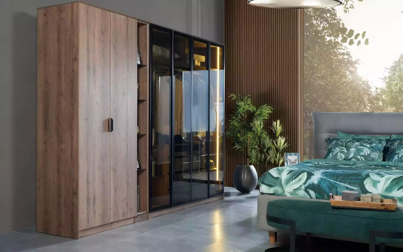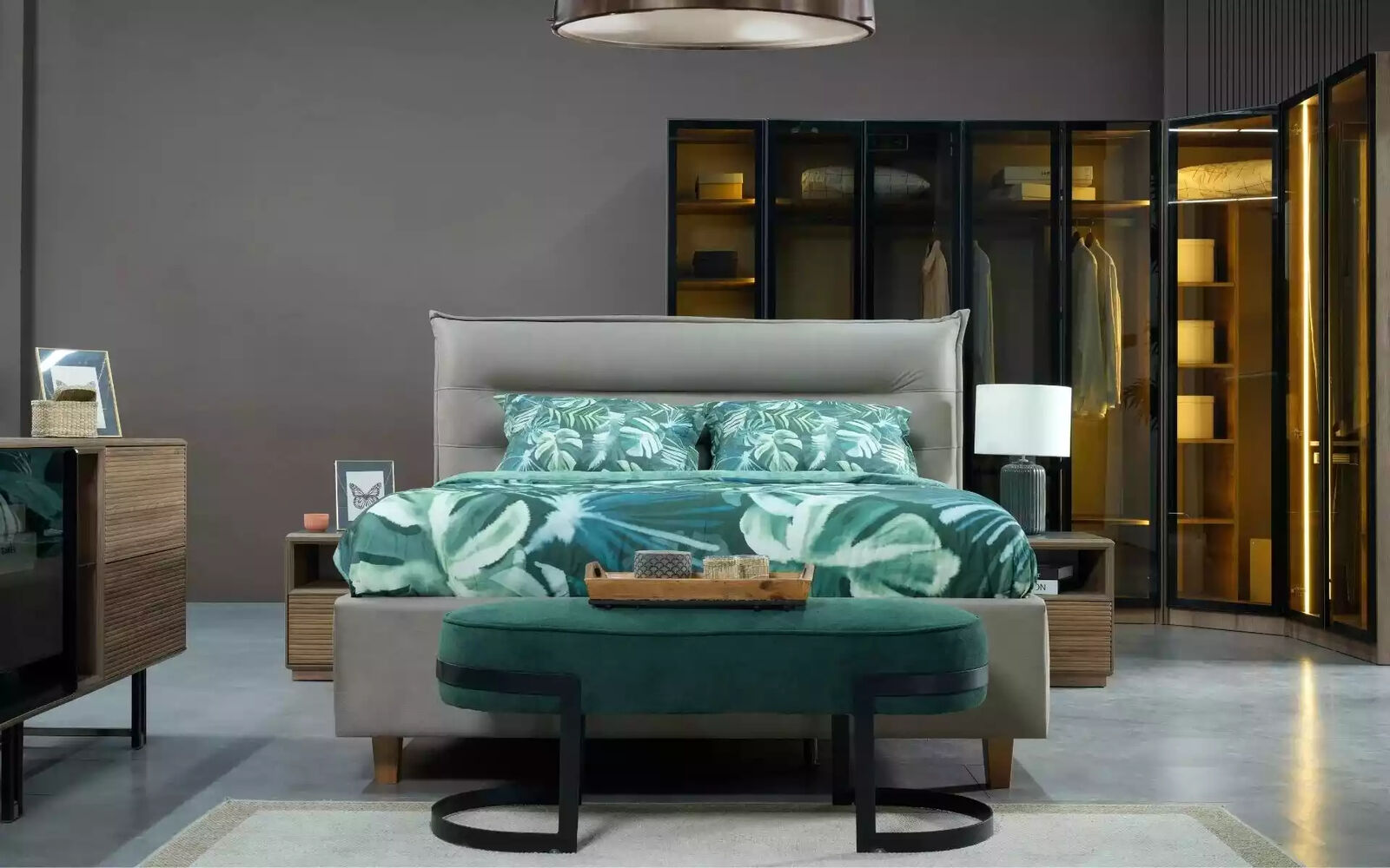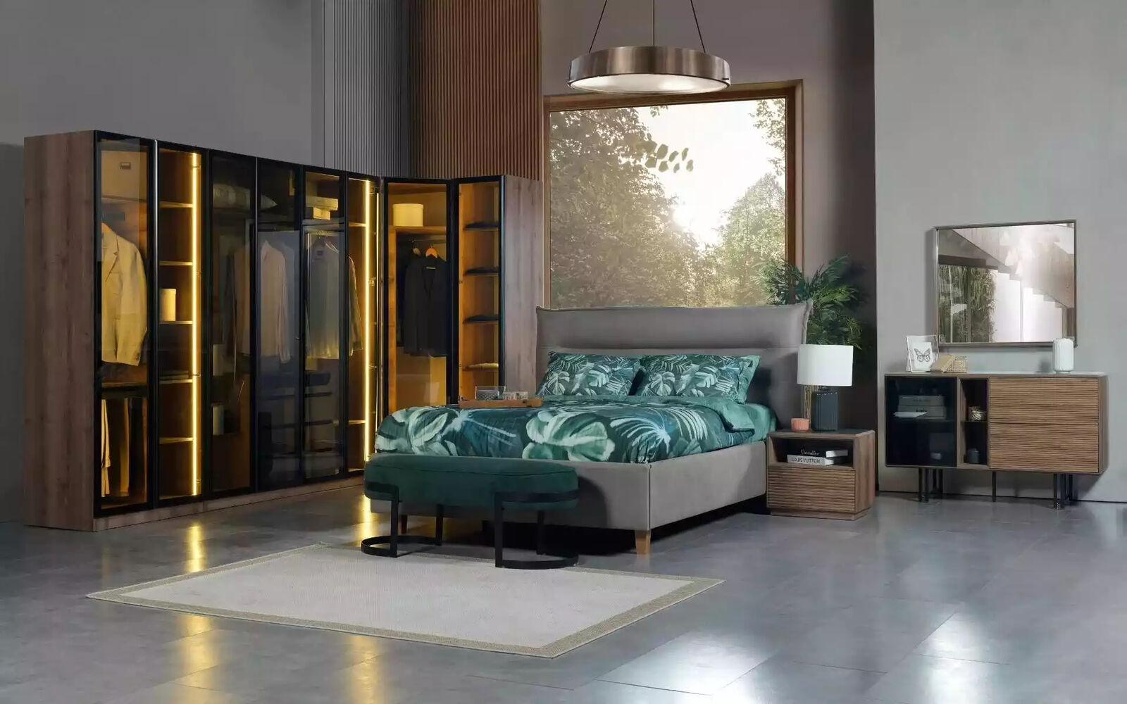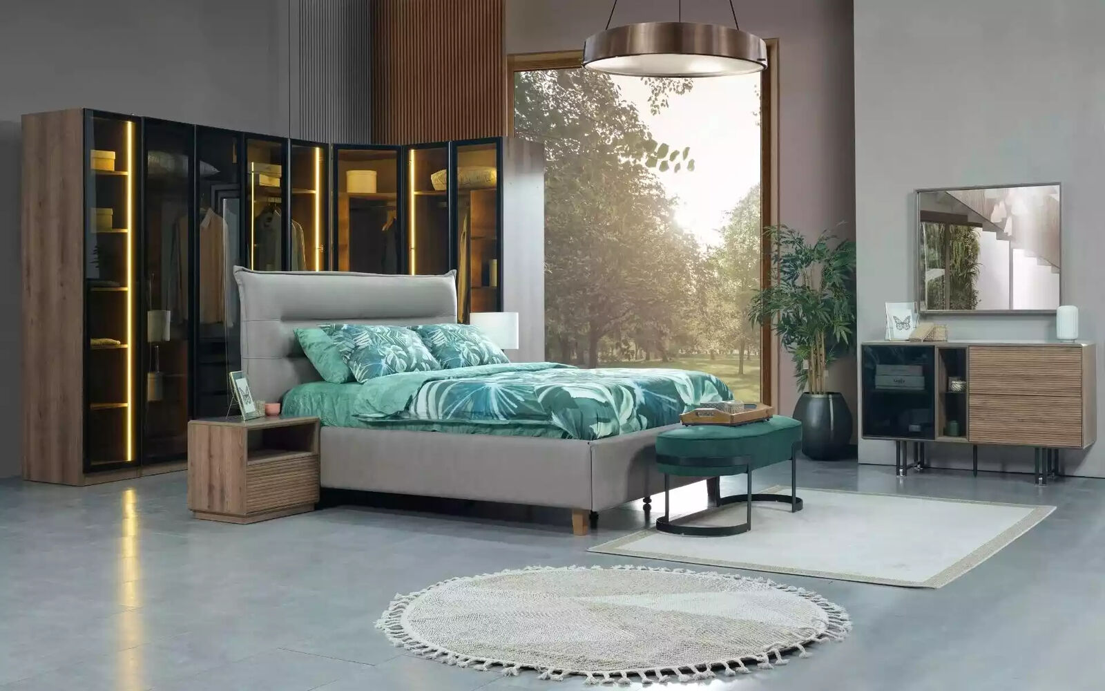 Chambre à coucher Loft Design Lit Armoire Lits Commode Table de chevet 5 pièces est un ensemble de meubles de chambre à coucher au design moderne et élégant. Cet ensemble comprend un lit spacieux avec une surface de couchage d'environ 160 x 200 cm, une armoire imposante de 295 x 60 x 230 cm, une commode pratique de 130 x 50 x 85 cm, ainsi que deux tables de nuit de 45 x 60 x 50 cm chacune. Fabriqué en bois de haute qualité avec des finitions textiles, cet ensemble allie style et fonctionnalité pour créer un espace de repos harmonieux et confortable pour votre chambre.