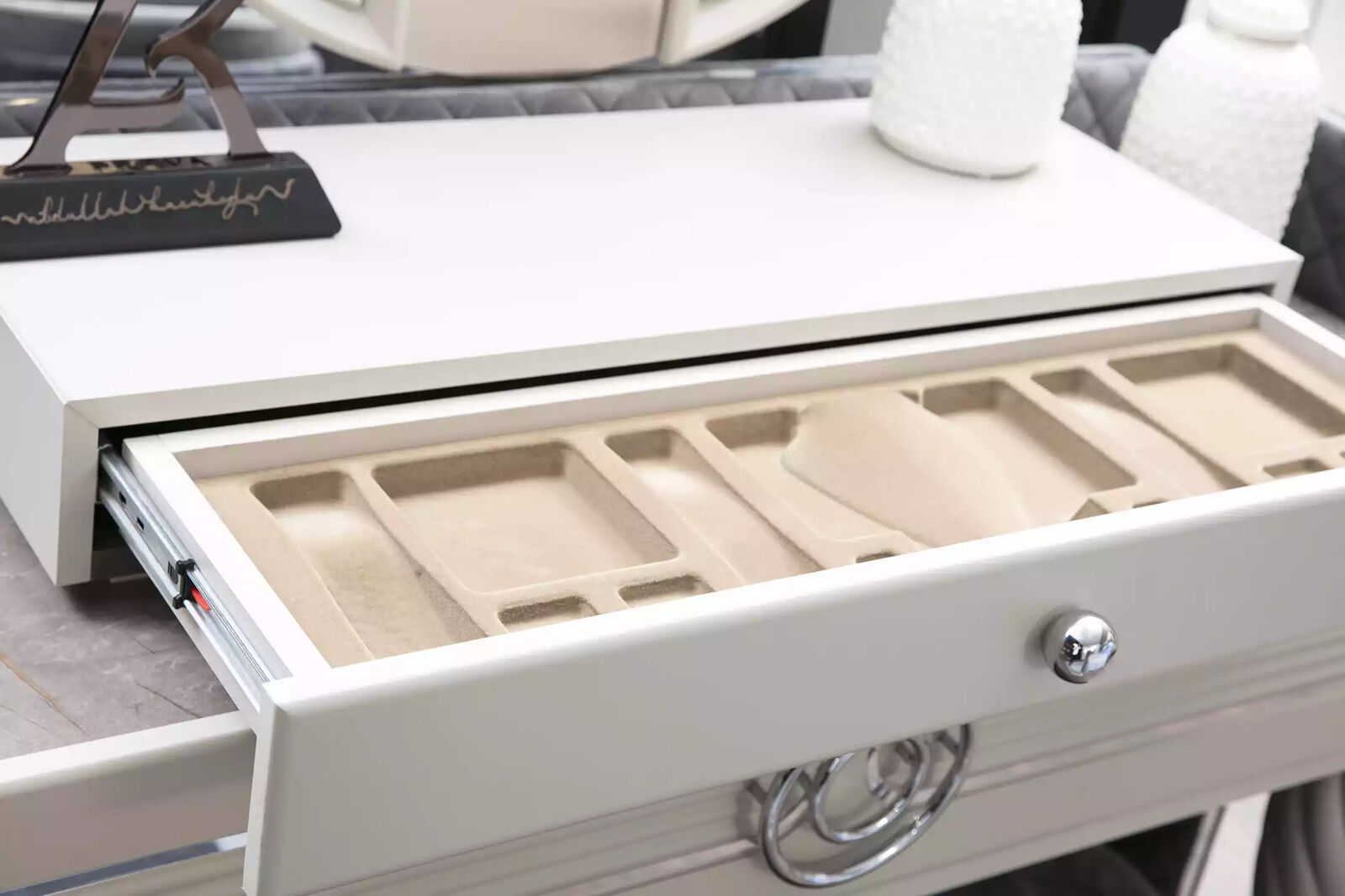 Cette **Coiffeuse de chambre avec miroir Luxe** est le complément parfait pour toute chambre à coucher. Avec des dimensions d'environ **88.5 x 48 x 127.5 cm**, cette coiffeuse offre un espace spacieux pour ranger vos cosmétiques, bijoux et accessoires. Le design moderne et élégant de cette console crée un point focal luxueux dans votre espace de vie, ajoutant une touche de sophistication et de fonctionnalité.