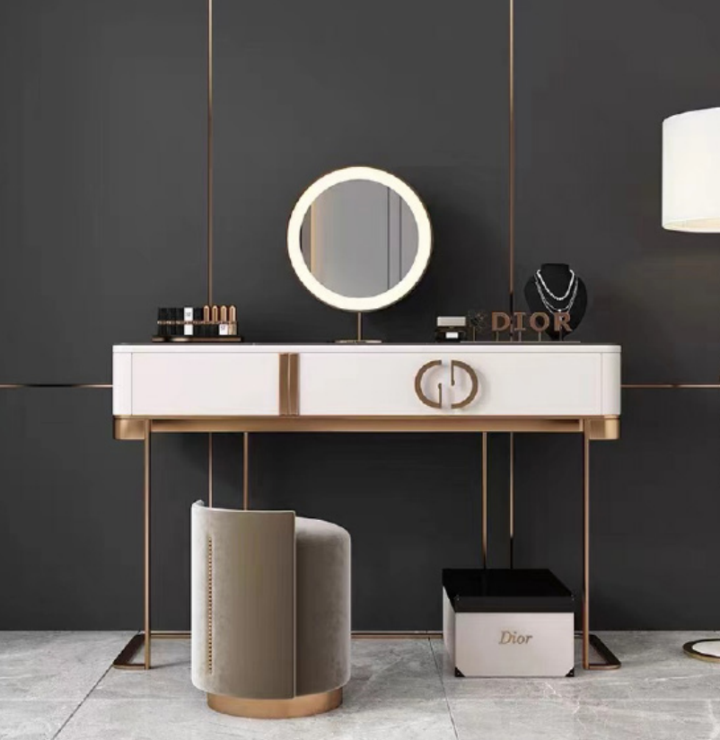Cette magnifique Coiffeuse Table de chevet Table de maquillage Console Chambre Commode est un ajout élégant et fonctionnel à votre espace. L'article est équipé d'une dimension spacieuse de 100/120 * 40 * 75 cm, offrant amplement d'espace pour ranger vos produits de beauté et accessoires. Fabriquée en bois de qualité avec des accents en acier inoxydable, cette coiffeuse est non seulement robuste et durable, mais elle ajoute également une touche de sophistication à votre chambre. La couleur chic comme indiquée est intemporelle, s'adaptant à divers styles de décoration.