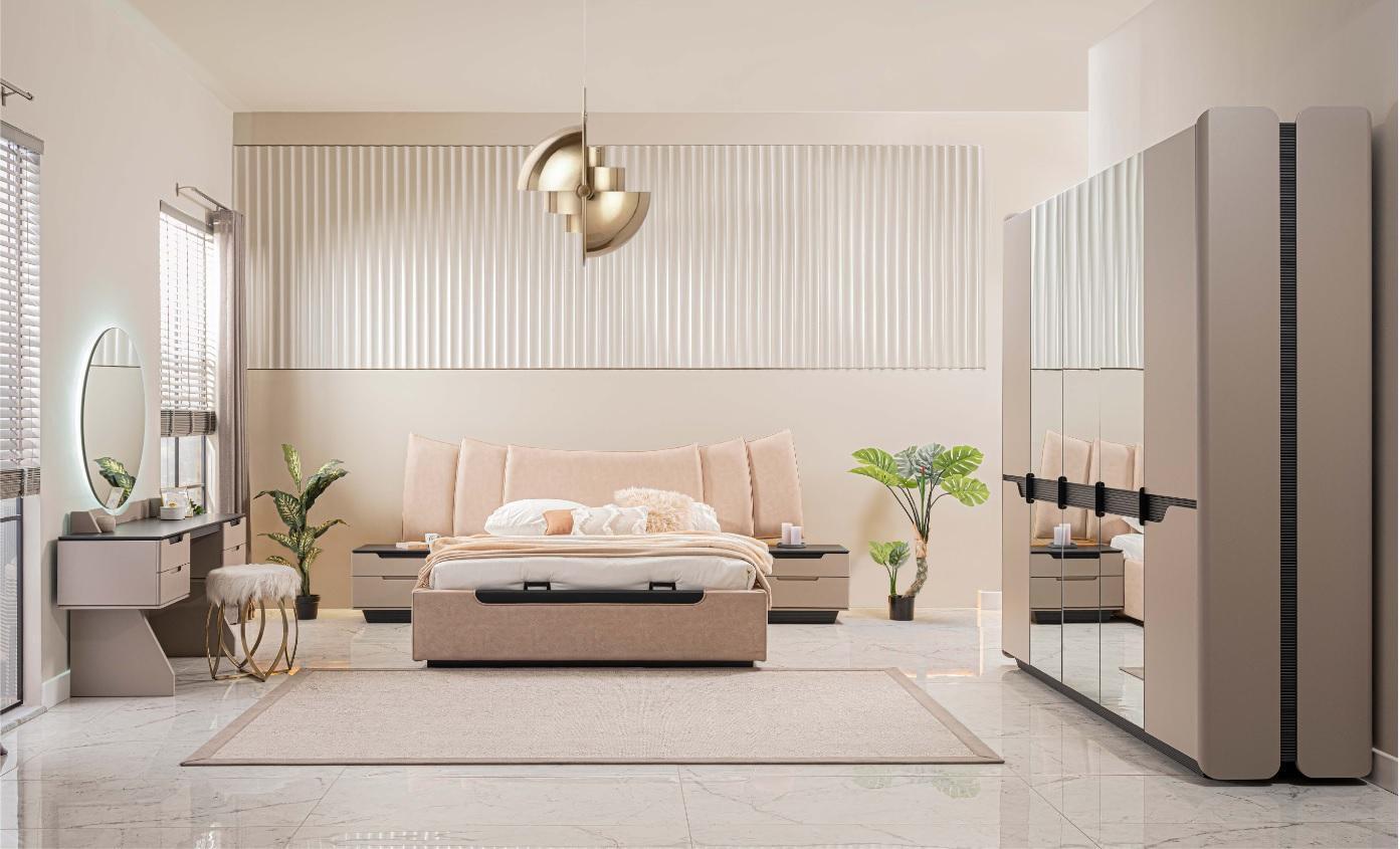 Chambre complète Lit double Moderne Ensemble de lit beige 6 pièces Armoire
