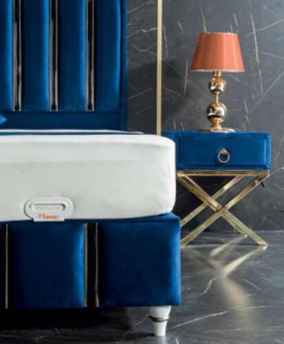 Le lit design de SaphirBlue avec des tables de chevet sur des pieds en acier plaqué or