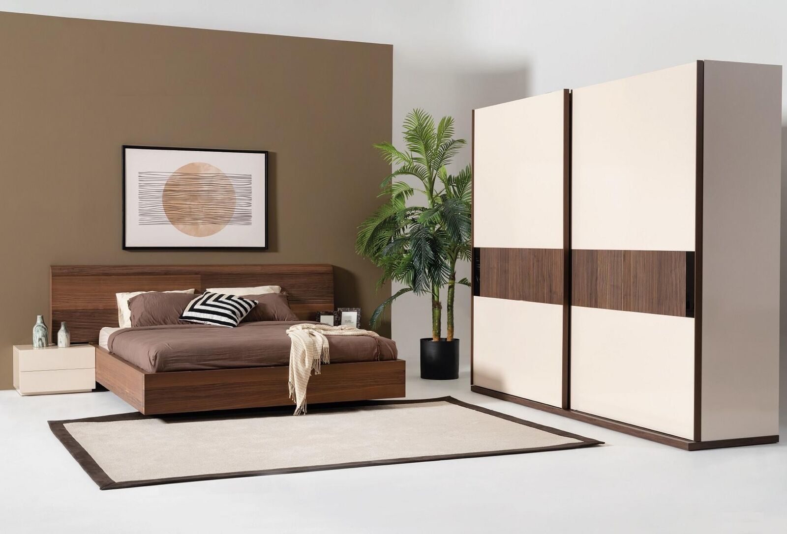 Lit moderne élégant avec deux tables de chevet en bois naturel