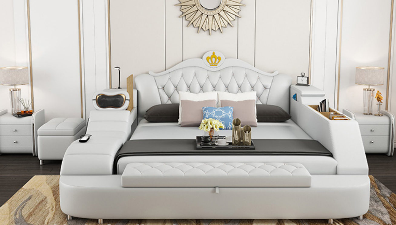 Ce lit multifonctionnel est équipé de nombreuses fonctionnalités innovantes pour améliorer votre expérience quotidienne. Profitez de l'éclairage LED sous le lit pour une ambiance relaxante, des compartiments de tiroirs discrets pour un rangement organisé, et des enceintes avec connexion Bluetooth pour une expérience audio immersive. De plus, la chaise longue relaxante avec fonction massage et la table réglable ajoutent une touche de luxe à votre espace de vie. Avec des options de finition en cuir premium ou tissu de haute qualité, ce lit s'adapte à votre style personnel tout en offrant un confort durable et un design élégant.