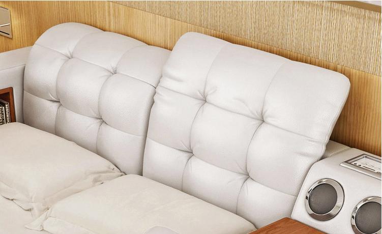 Pour une personnalisation ultime, choisissez parmi différentes options de revêtement incluant du cuir synthétique premium ou du cuir véritable premium. La structure en bois véritable assure une durabilité optimale, tandis que les multiples fonctionnalités telles que le port USB, le Bluetooth, les enceintes intégrées et le coffre-fort offrent un confort moderne. Cette étagère de lit multifonction est un choix idéal pour ceux qui recherchent un design raffiné et des fonctionnalités innovantes tout en maximisant l'espace de leur chambre à coucher.