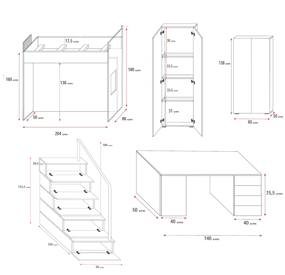 Ce lit superposé multifonction est idéal pour les petites chambres d'enfants, offrant un gain de place significatif tout en offrant un design attrayant et des fonctionnalités pratiques. L'escalier inclus facilite l'accès au lit supérieur en toute sécurité, tandis que la surface de matelas généreuse assure un sommeil paisible et confortable pour vos enfants. Parfait pour créer un espace de jeu et de travail dans la chambre, ce lit superposé double Rosa Table Armoire deviendra rapidement un élément central de l'univers de votre enfant, combinant à la fois confort, style et fonctionnalité pour une chambre d'enfant complète et harmonieuse.