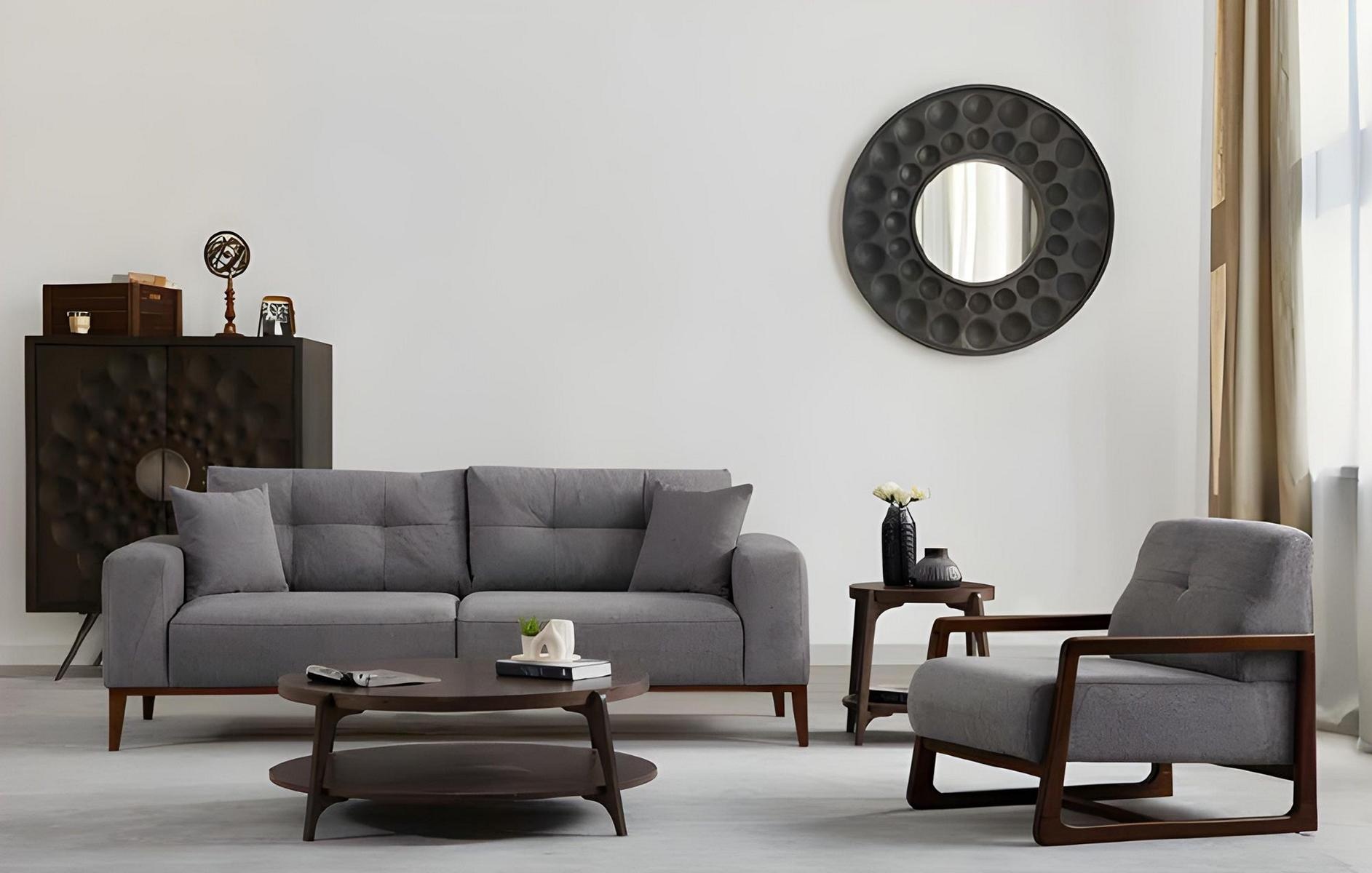 Canapé design gris-noir pour salon avec fauteuils en tissu