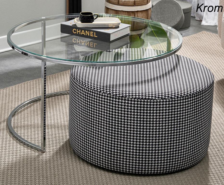 Ensemble de salon Table basse en verre et métal + tabouret rembourré