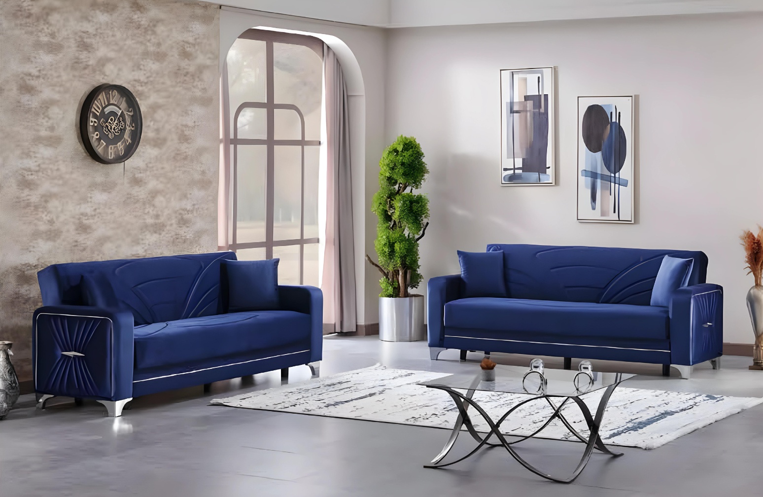 L'ensemble de canapé design pour salon, composé de deux canapés trois places, incarne l'élégance contemporaine. Revêtu d'un somptueux polyester bleu, chaque pièce offre un confort inégalé tout en ajoutant une touche raffinée à votre espace de vie. Les lignes épurées et le rembourrage généreux garantissent un soutien optimal, soulignant un savoir-faire exceptionnel. Conçu pour ceux qui apprécient le luxe, cet ensemble crée une atmosphère accueillante et sophistiquée, idéale pour des moments de convivialité ou de détente. Opter pour cet ensemble, c'est choisir de vivre dans l'exclusivité et d'affirmer son goût pour l'art de vivre à la française.