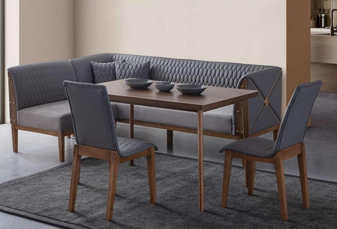 Suite de salle à manger grise et élégante avec table à manger brune et 2 tabourets.