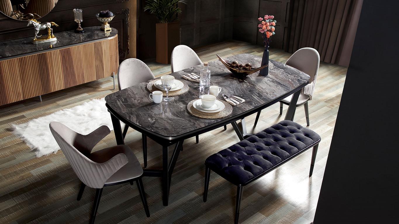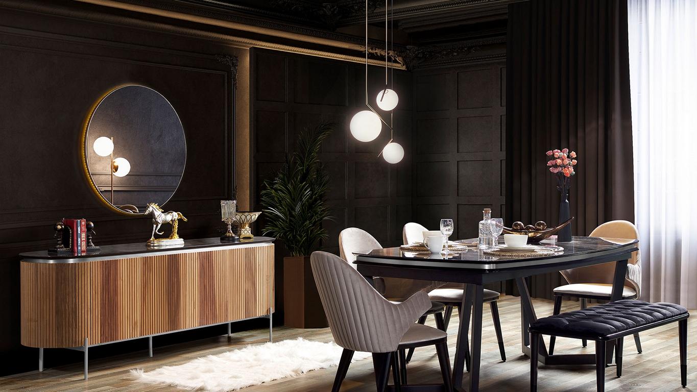 Mots-clés : Aménagements exclusifs, ensemble de salle à manger de luxe, tabouret Chesterfield
