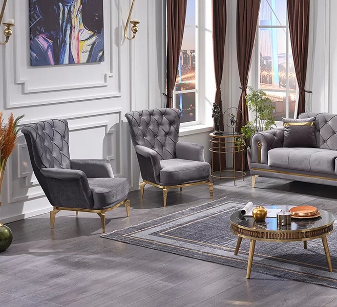 Le fauteuil Chesterfield incarne l'élégance intemporelle, alliant confort et sophistication dans un écrin de luxe. Revêtu d'un tissu en polyester gris d'une qualité exceptionnelle, il offre un toucher doux et une durabilité remarquable. Ses lignes classiques et son rembourrage généreux en font le choix idéal pour un salon raffiné, où chaque moment se transforme en une expérience de pur bien-être. Ce meuble, symbole de l’art de vivre, s'intègre harmonieusement dans des intérieurs contemporains ou traditionnels, ajoutant une touche de prestige à votre espace. Choisir ce fauteuil, c'est opter pour un style de vie exclusif, où le confort rencontre le luxe, tout en reflétant l'héritage de vingt ans d’expertise en mobilier haut de gamme.